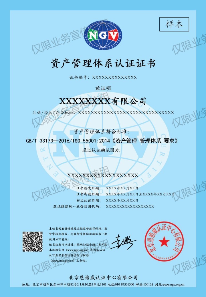认证依据旧版标准为GB/T 33173—2016/ISO 55001:2014《资产管理 管理体系 要求》,认证依据新版标准为ISO 55001:2024《资产管理 管理体系 要求》