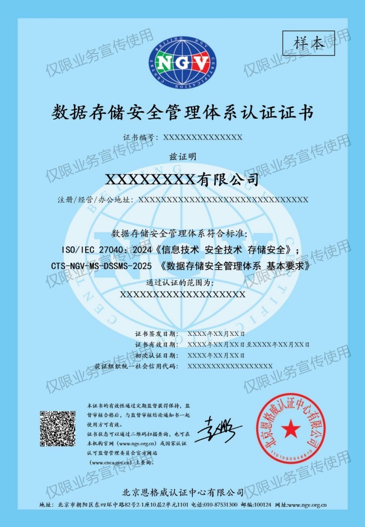 认证依据新版标准:ISO/IEC 27040:2024《信息技术 安全技术 存储安全》和CTS-NGV-MS-DSSMS-2025 《数据存储安全管理体系 基本要求》